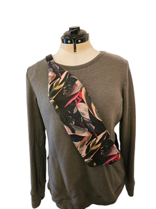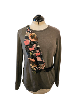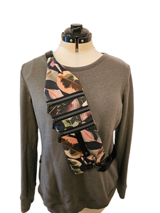 Product details for Triple Sling Crossbody with Tropical Plant Design.