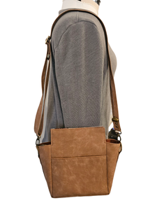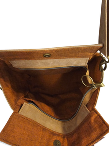 Made using vinyl, cotton and canvas. Bronze hardware. Adjustable strap.